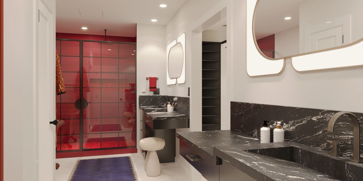 This bathroom remodel and walk-in closet transformation embraces bold character, curated finishes, and confident personal expression. Designed as a deeply individualized space, it merges warmth, drama, and functionality with an eye for both craftsmanship and storytelling.
